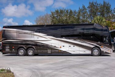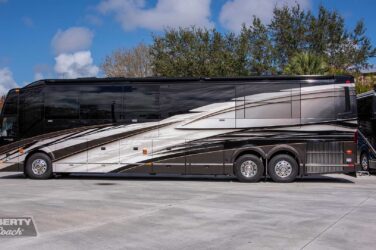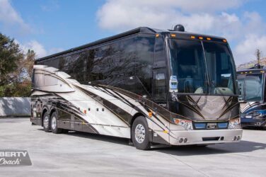 Sheer elegance – that's the word on this breathtaking Calabria bath-and-a-half edition, custom built on Prevost's ultra-spacious H3-45 quad slide platform. With its one-of-a-kind penthouse-grade interior design from Kim Konigseder, along with another signature Dean Loucks exterior and a full complement of cutting edge Liberty features, this is truly the state-of-the-art in motorcoach design. In top condition with only 26,500 miles.