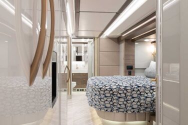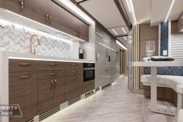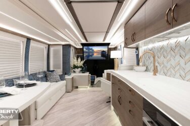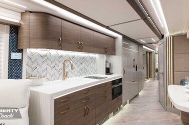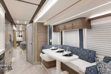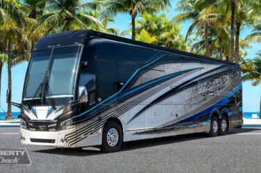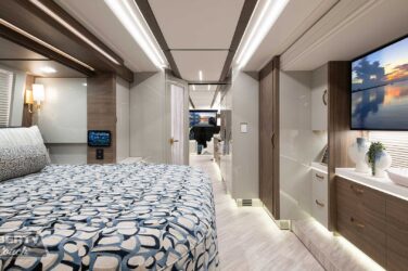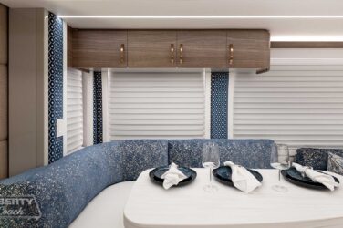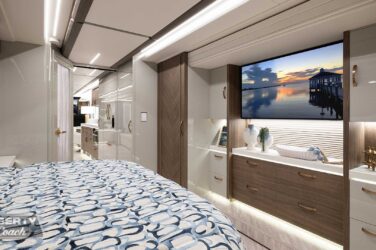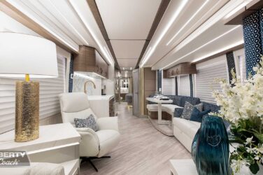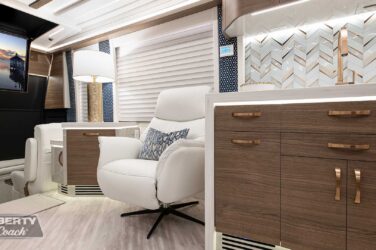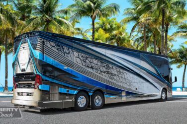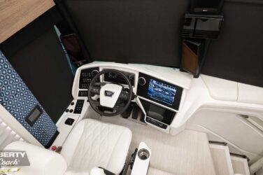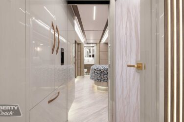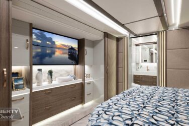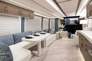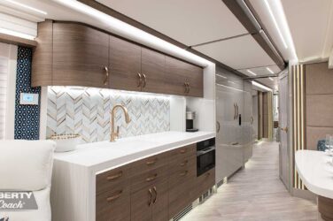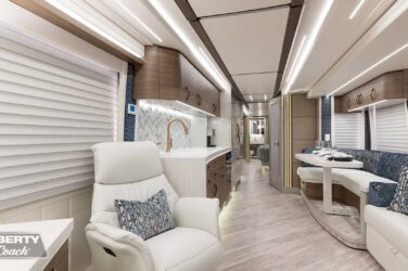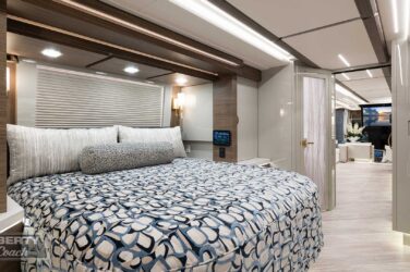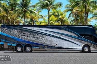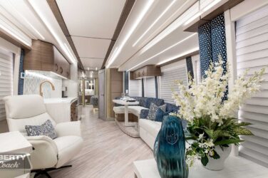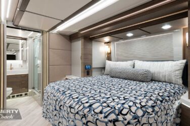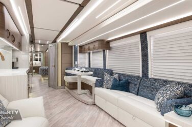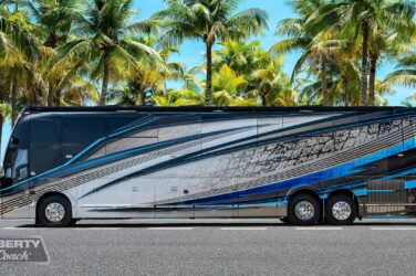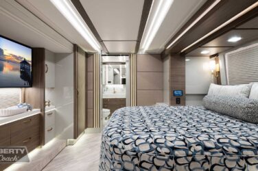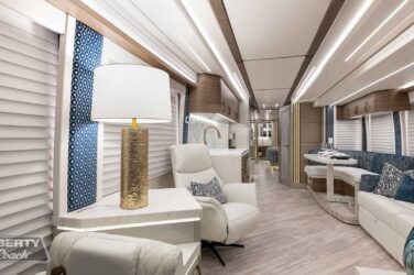 Since its debut in 2021, the Serrado-B Triple S-Slide has been our most popular plan and for good reason. With the expansive dual Super Slide rear bedroom suite and extended galley in the salon, the layout presents an ideal canvas for the contemporary chic of Kim Konigseder’s “Liberty Look” design artistry. Which is precisely what Elegant Lady #931 showcases in stunning fashion, along with the exterior design wizardry of Dean Loucks and a full complement of our cutting edge systems and components.
